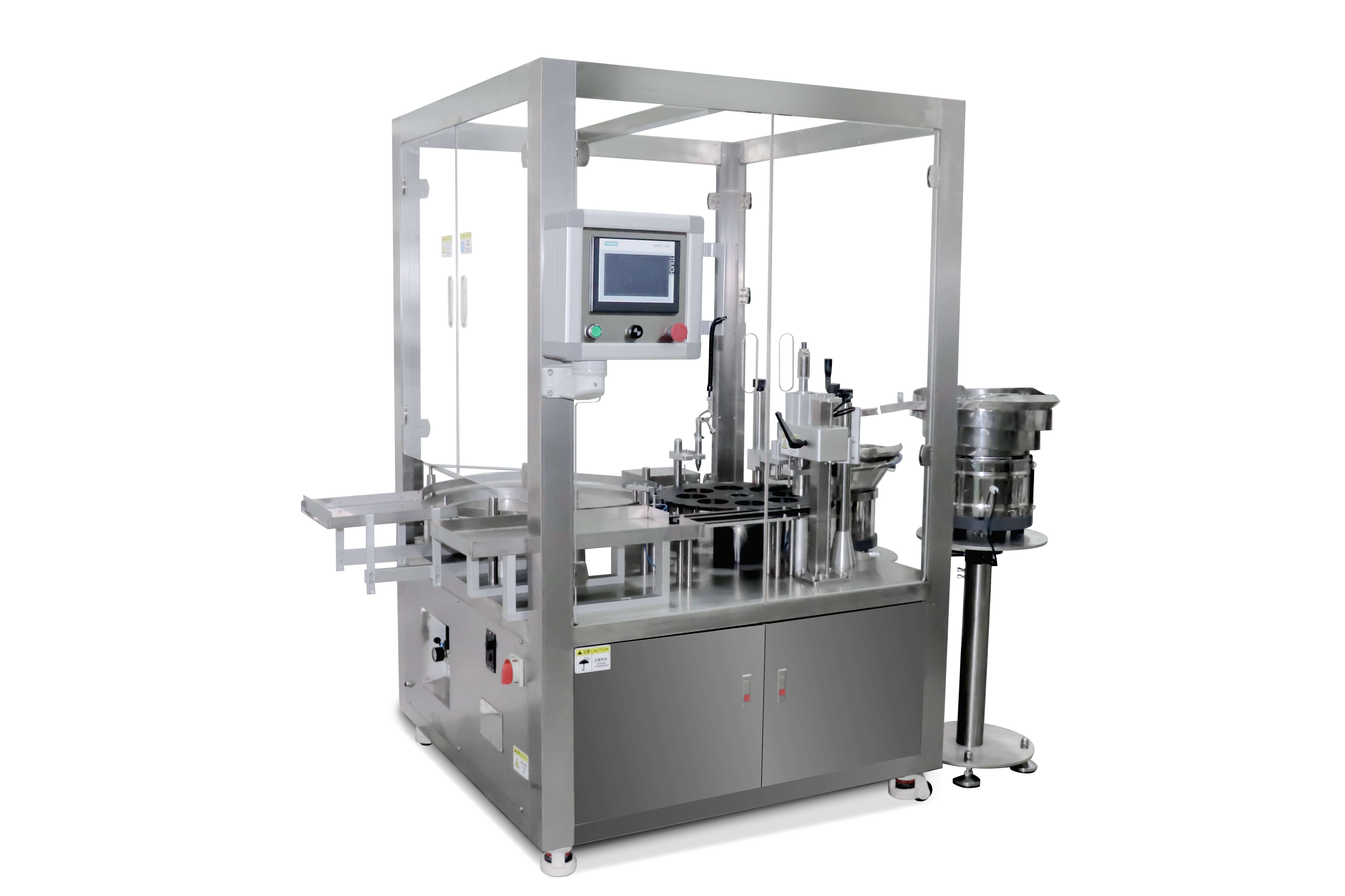 自動(dòng)灌裝軋蓋機(jī)一體機(jī)可用于西林瓶、精油瓶、香水瓶全自動(dòng)灌裝旋蓋及鎖蓋設(shè)備。整套流程分為:理瓶-灌裝-壓塞-掛蓋-軋蓋,其特點(diǎn)為生產(chǎn)穩(wěn)定,對包材通用性強(qiáng)。